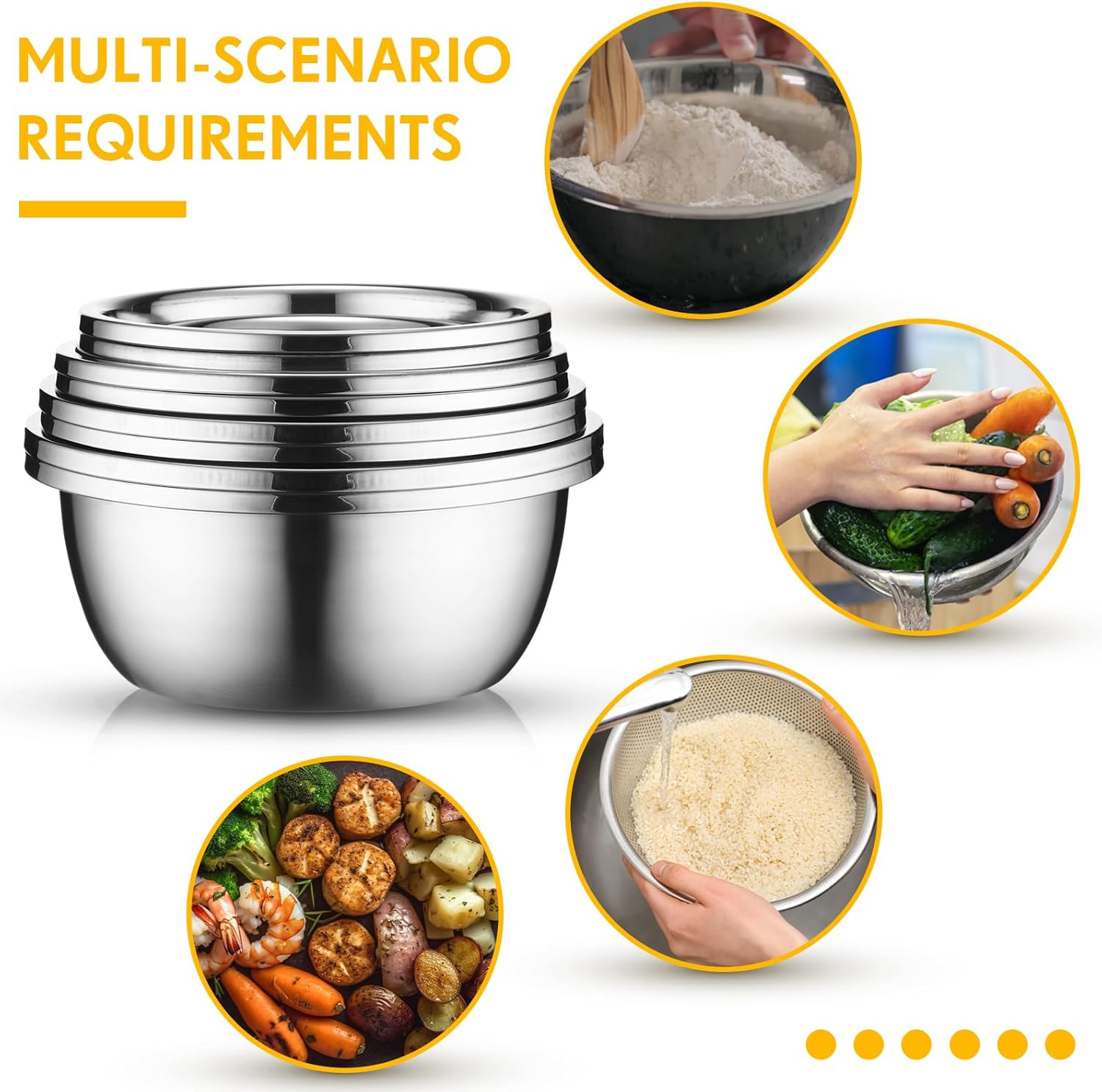 Features: Ideal kitchen helper: Aside from its practicality, this metal mixing bowl set is also a thoughtful accessory for making baking more fun and engaging, hence serving as an ideal kitchen helper. Enough capacity: The mixing bowl set has 4 different sizes to meet your large capacity needs. You can choose the right size bowl according to your usage and ingredient size, giving you a pleasant cooking experience. Specifications: Material: stainless steels Color: silvery Size: 7.87 inches in outer diameter, 3.54 inches in height, 1.8 qt in capacity 10.24 inches in outer diameter, 4.21 inches in height, 3.9 qt in capacity 11.02 inches in outer diameter, 4.41 inches in height, 4.9 qt in capacity 11.81 inches in outer diameter, 4.53 inches in height, 6.6 qt in capacity Package includes: 4 x Colanders 4 x Mixing bowls Notes: Manual measurement, please allow slight errors on size. The color may exist a slight difference due to different screen displays.